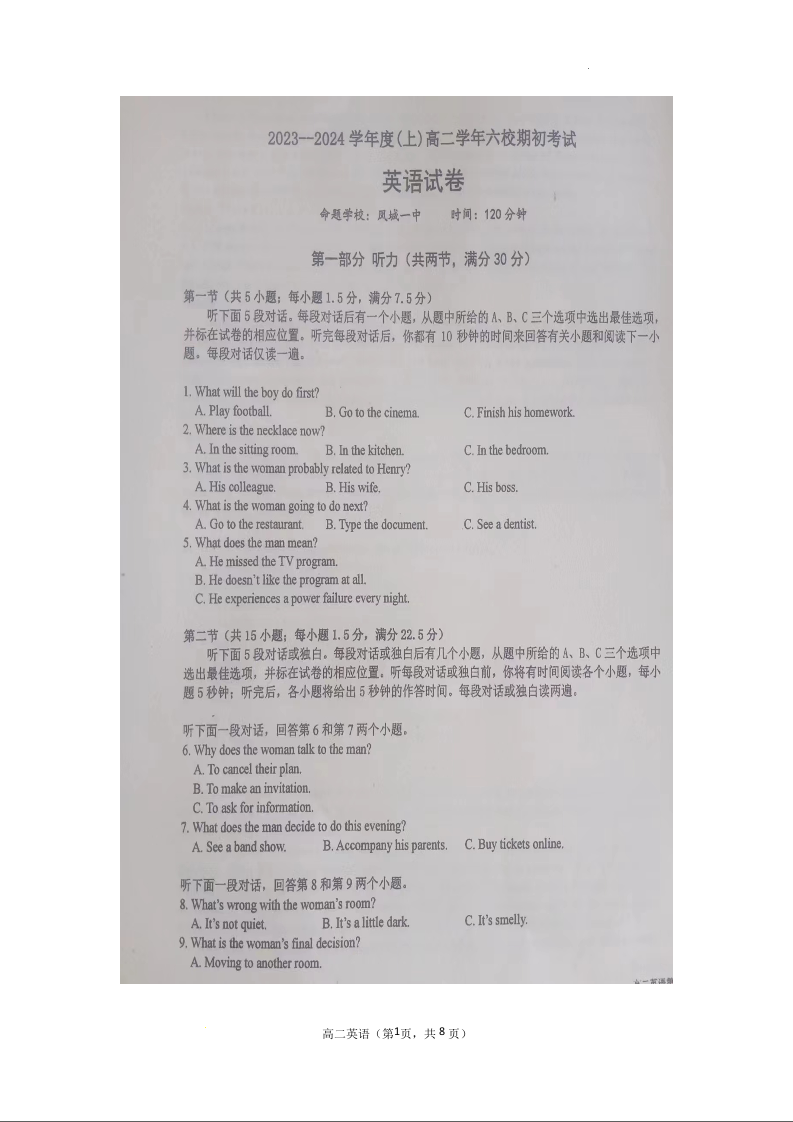 辽宁省六校协作体2023-2024学年高二上学期开学考试英语