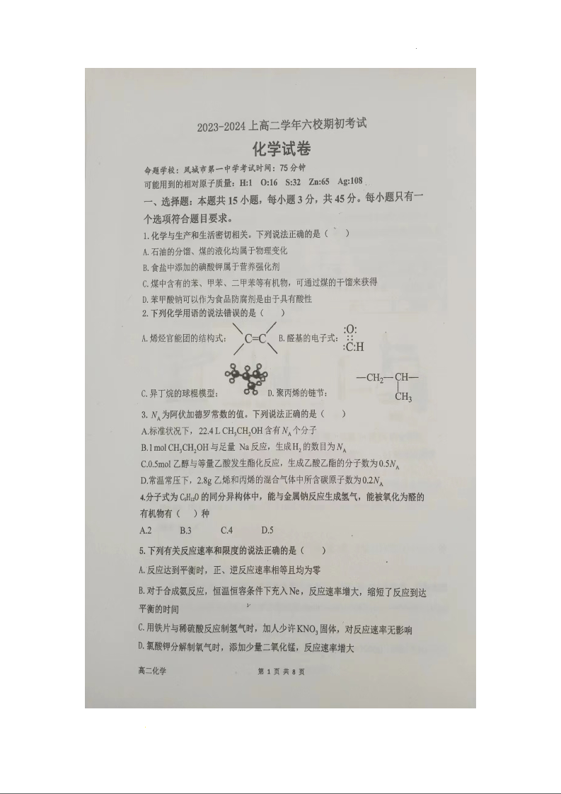 辽宁省六校协作体2023-2024学年高二上学期开学考试化学