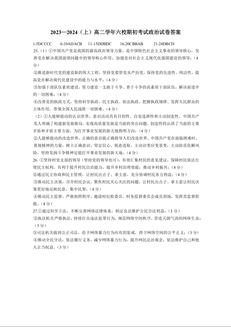 辽宁省六校协作体2023-2024学年高二上学期开学考试政治答案