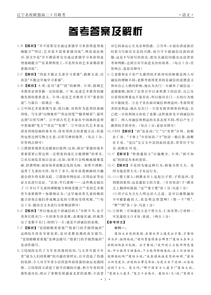 辽宁省名校联盟2023-2024学年高二上学期9月联合考试语文答案