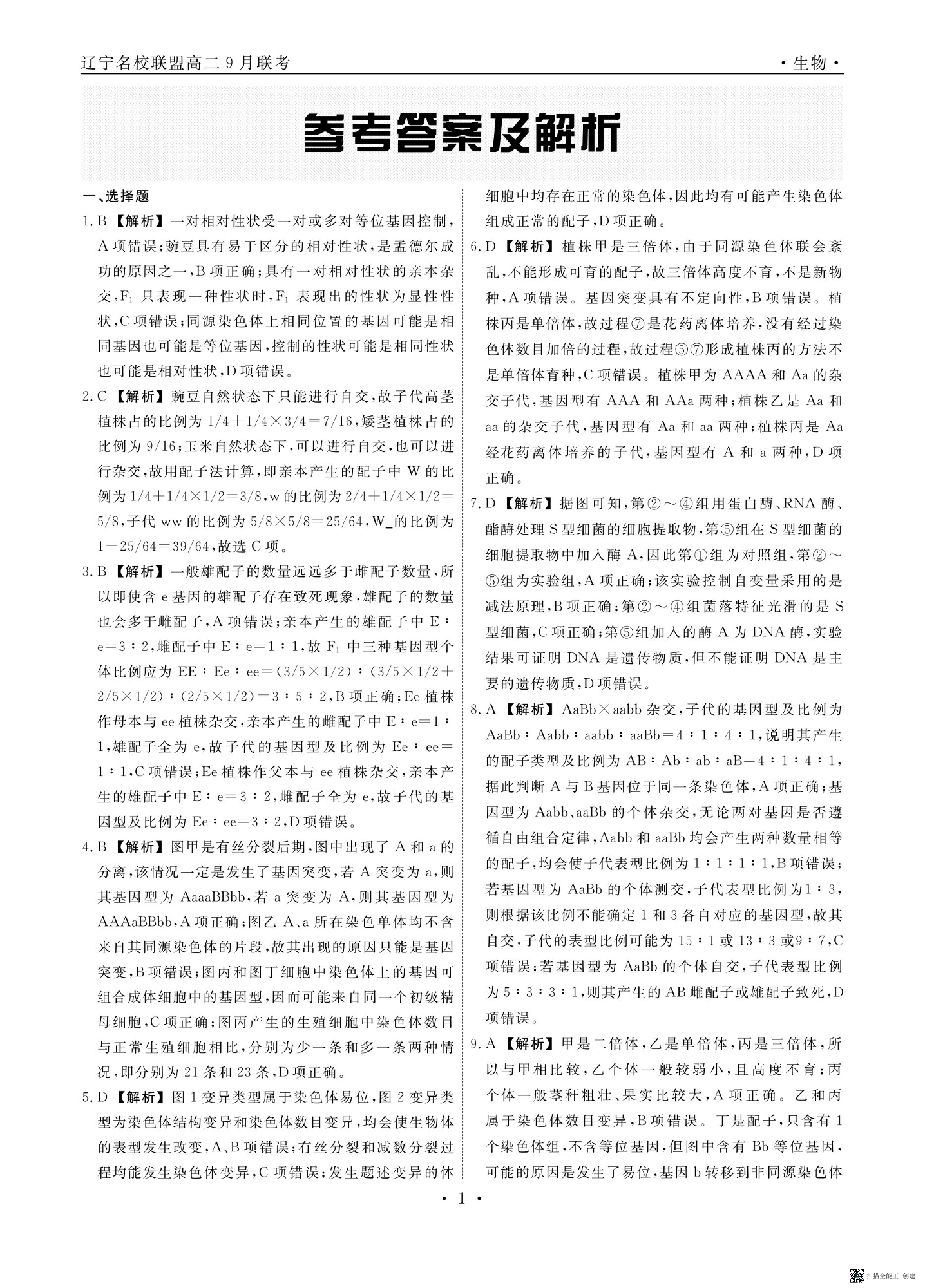 辽宁省名校联盟2023-2024学年高二上学期9月联合考试生物答案