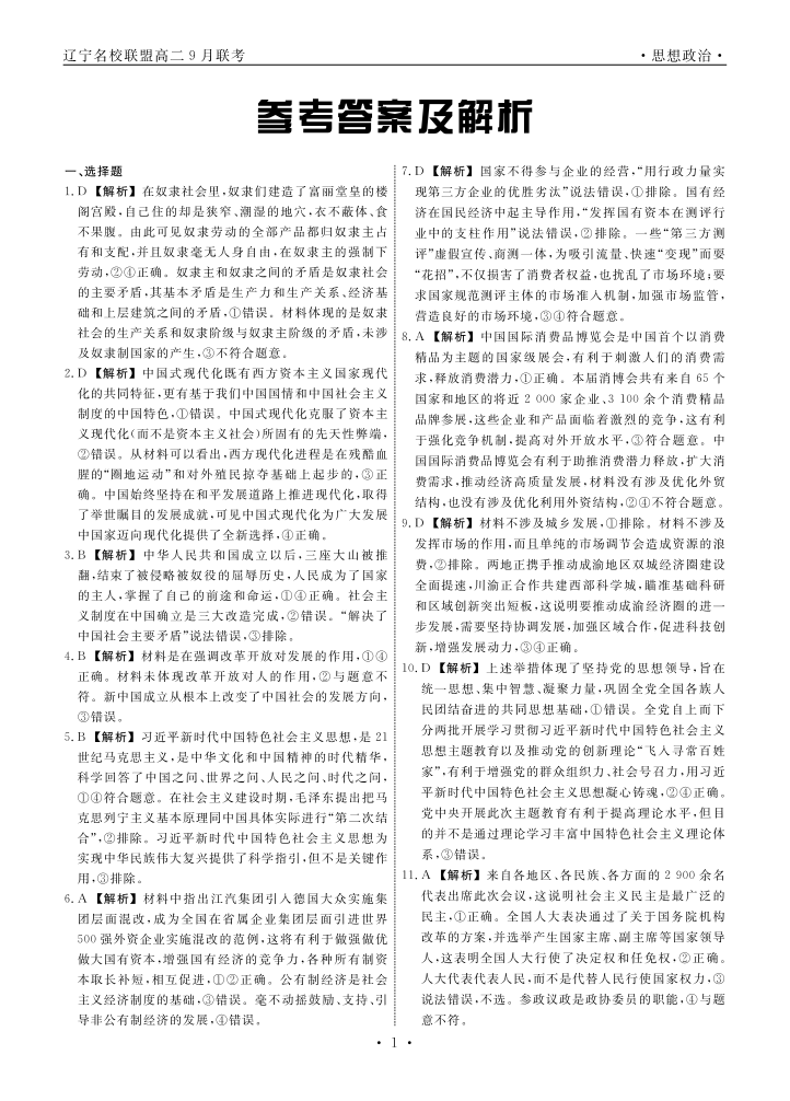 辽宁省名校联盟2023-2024学年高二上学期9月联合考试政治答案