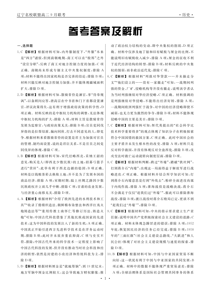 辽宁省名校联盟2023-2024学年高二上学期9月联合考试历史答案
