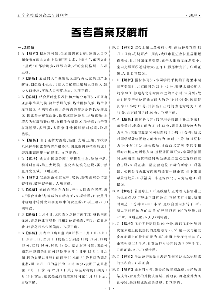 辽宁省名校联盟2023-2024学年高二上学期9月联合考试地理答案