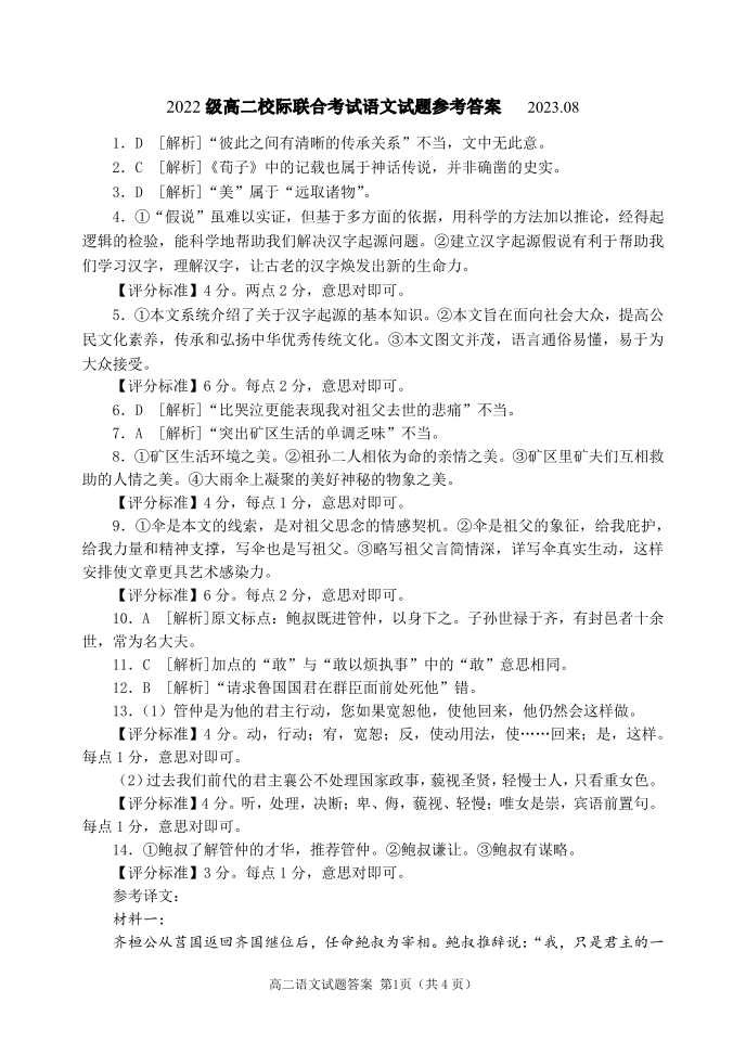 山东省日照市2023-2024学年高二上学期开学考试语文答案