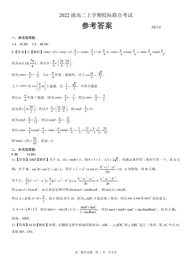 山东省日照市2023-2024学年高二上学期开学考试数学答案