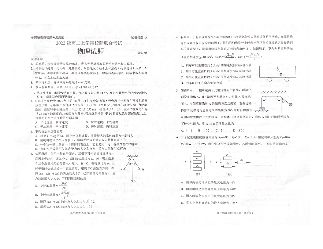 山东省日照市2023-2024学年高二上学期开学考试物理