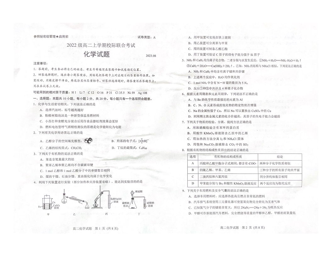 山东省日照市2023-2024学年高二上学期开学考试化学