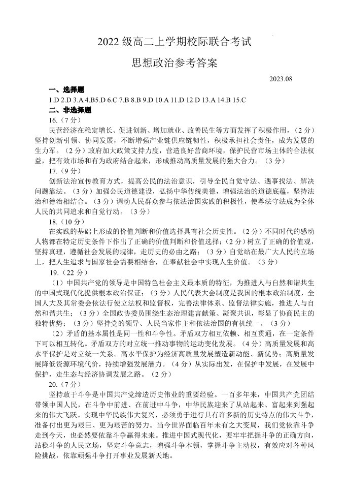 山东省日照市2023-2024学年高二上学期开学考试政治答案