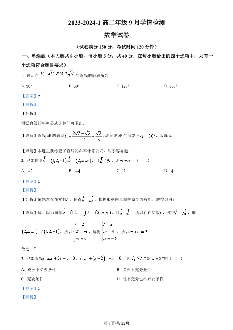 山西省大同市第一中学2023-2024学年高二上学期9月月考数学(精品解析版)