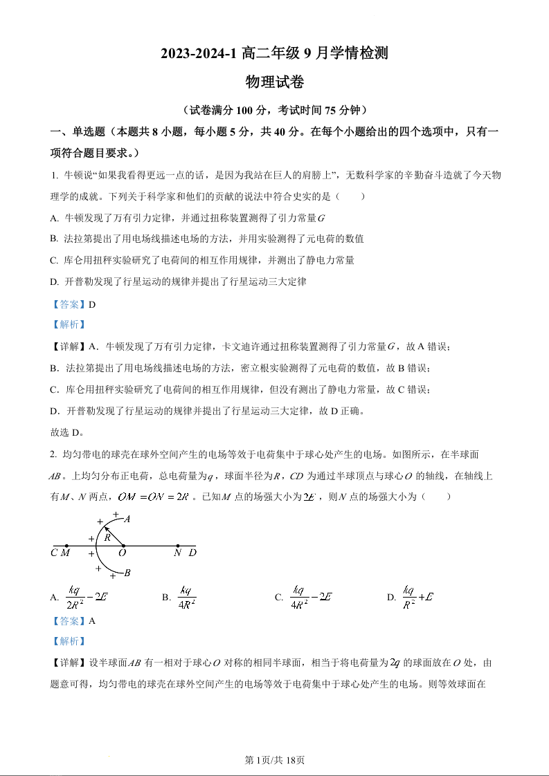 山西省大同市第一中学2023-2024学年高二上学期9月月考物理(精品解析版)