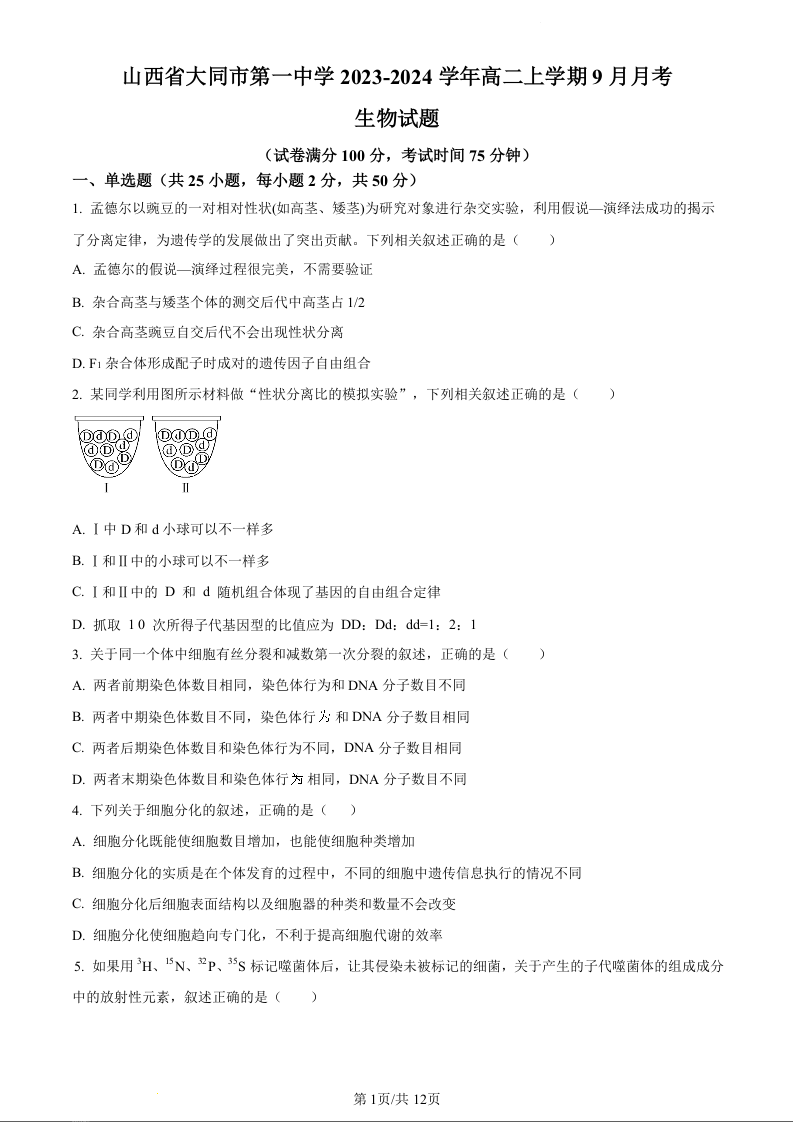 山西省大同市第一中学2023-2024学年高二上学期9月月考生物(原卷版)