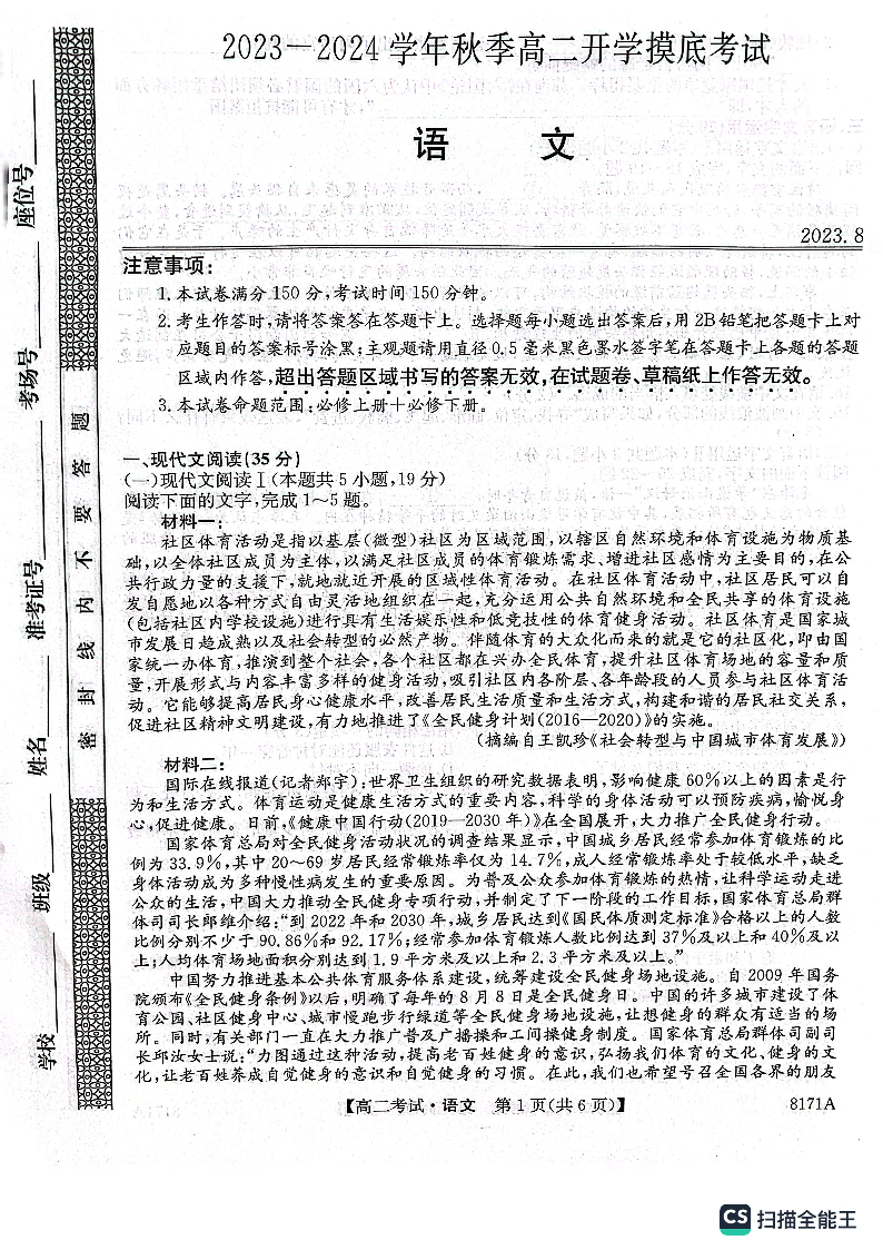陕西省安康市2023-2024学年高二上学期开学考试语文