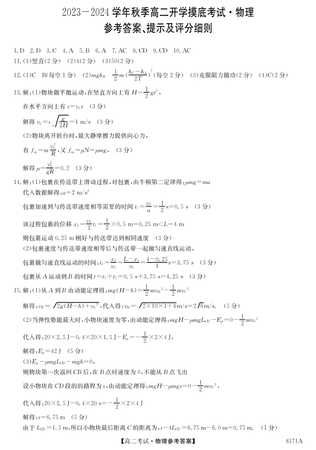 陕西省安康市2023-2024学年高二上学期开学考试物理答案