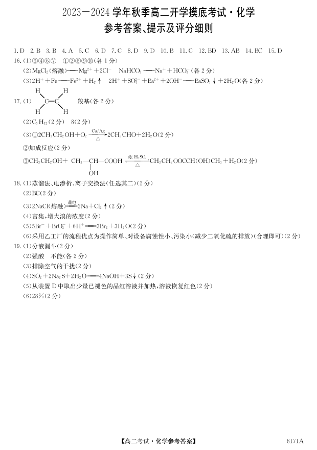 陕西省安康市2023-2024学年高二上学期开学考试化学答案