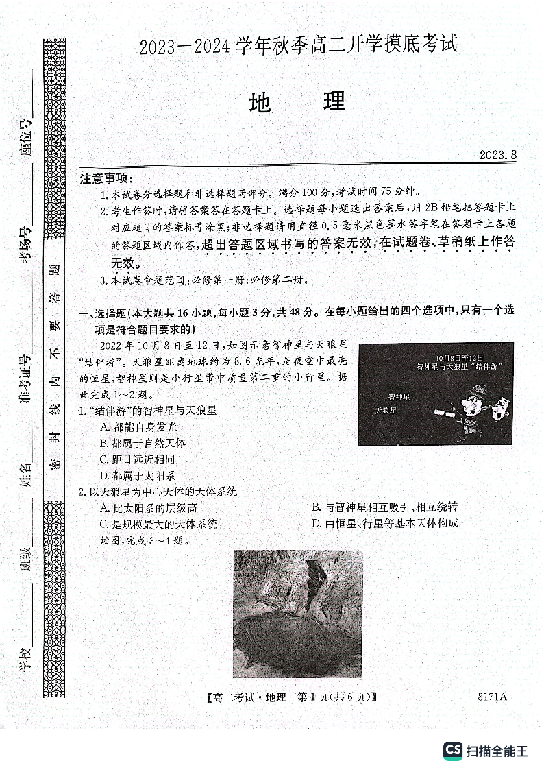 陕西省安康市2023-2024学年高二上学期开学考试地理