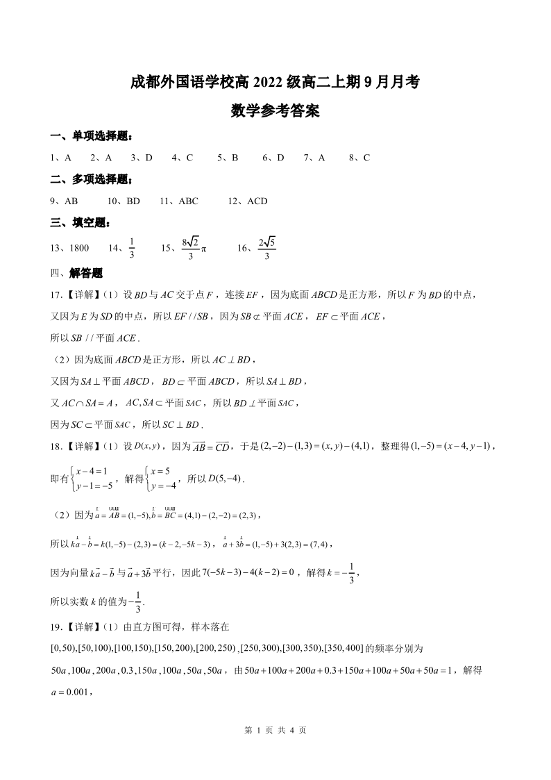 四川省成都外国语学校2023-2024学年高二上学期9月月考数学答案