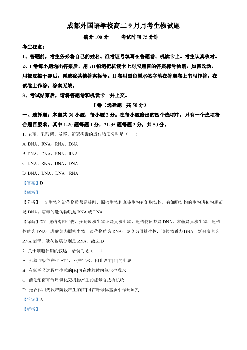 四川省成都外国语学校2023-2024学年高二上学期9月月考生物答案