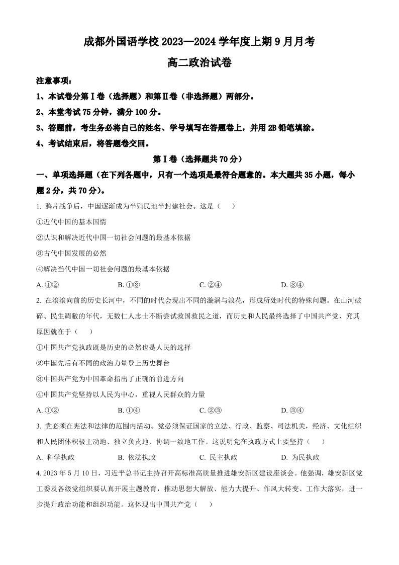 四川省成都外国语学校2023-2024学年高二上学期9月月考政治
