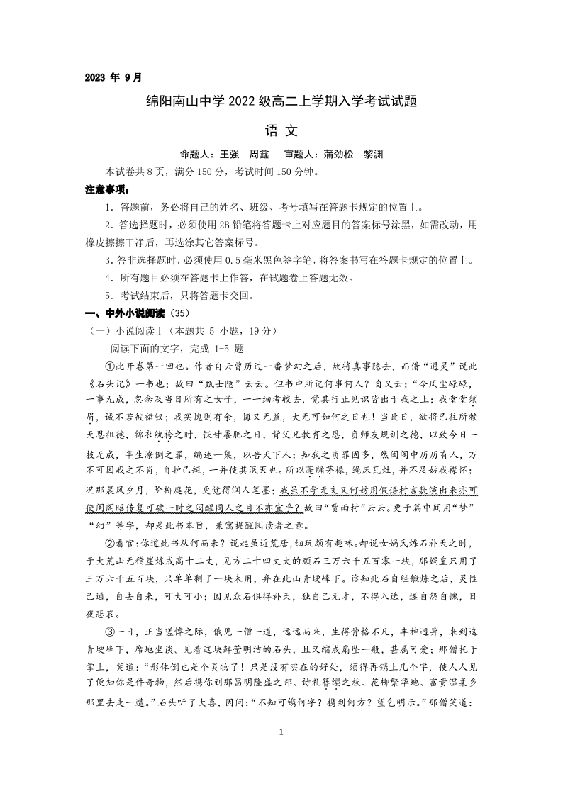 四川省绵阳南山中学2023-2024学年高二上学期开学考试语文