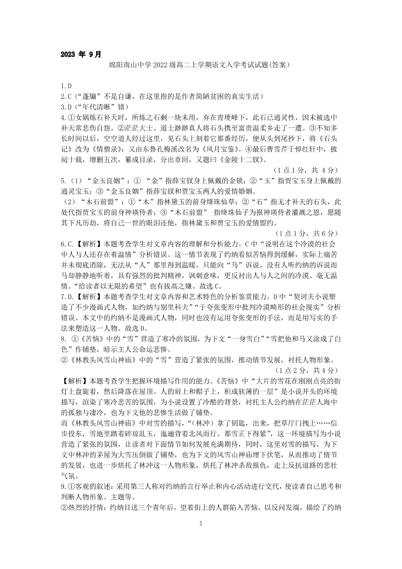四川省绵阳南山中学2023-2024学年高二上学期开学考试语文答案