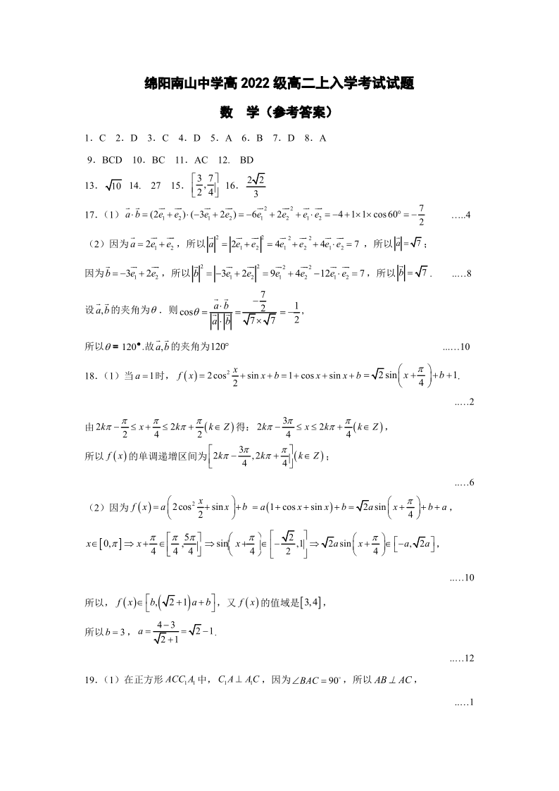 四川省绵阳南山中学2023-2024学年高二上学期入学考试数学答案