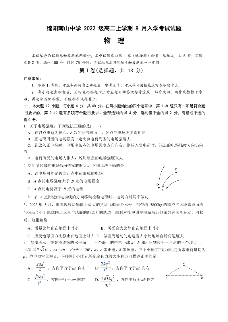 四川省绵阳南山中学2023-2024学年高二上学期开学考试物理