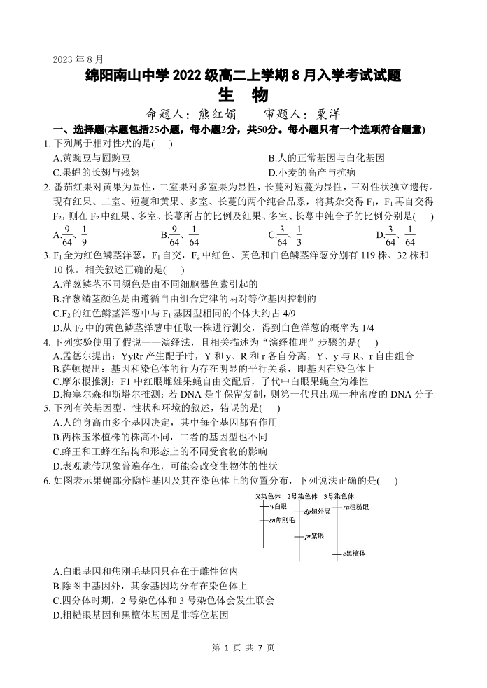 四川省绵阳南山中学2023-2024学年高二上学期入学考试生物