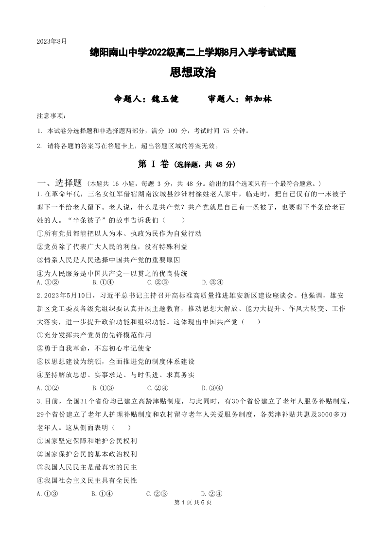 四川省绵阳南山中学2023-2024学年高二上学期开学考试政治