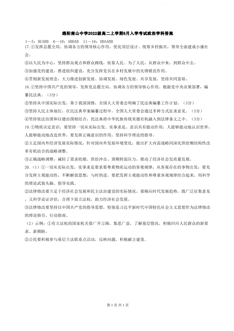 四川省绵阳南山中学2023-2024学年高二上学期开学考试政治答案
