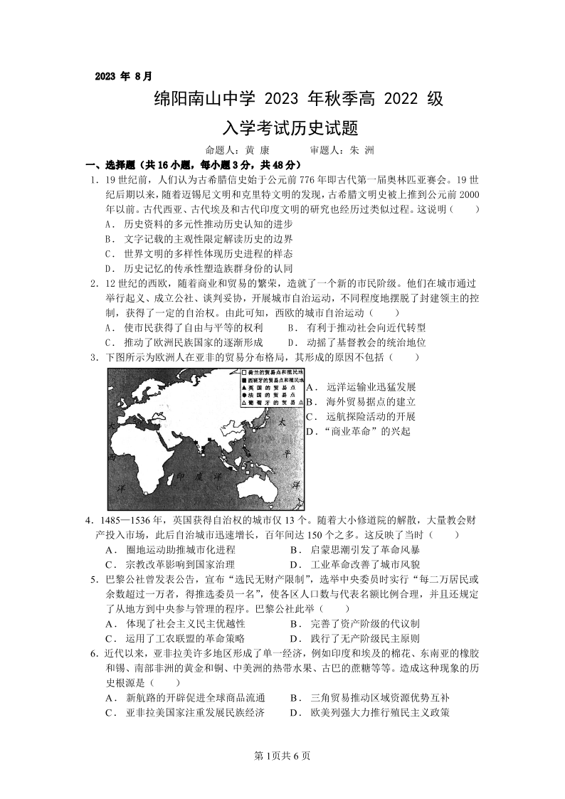 四川省绵阳南山中学2023-2024学年高二上学期入学考试历史