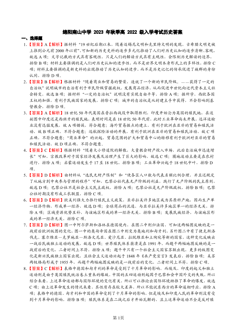 四川省绵阳南山中学2023-2024学年高二上学期入学考试历史答案