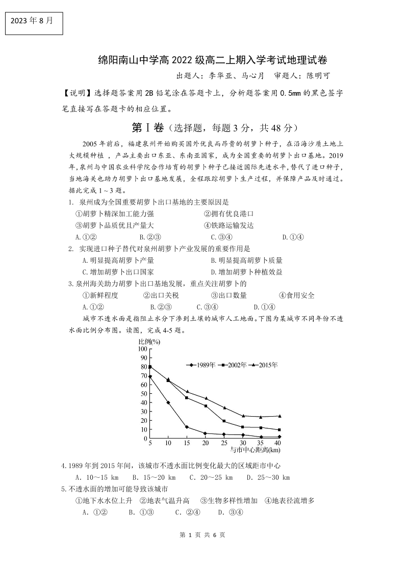 四川省绵阳南山中学2023-2024学年高二上学期入学考试地理