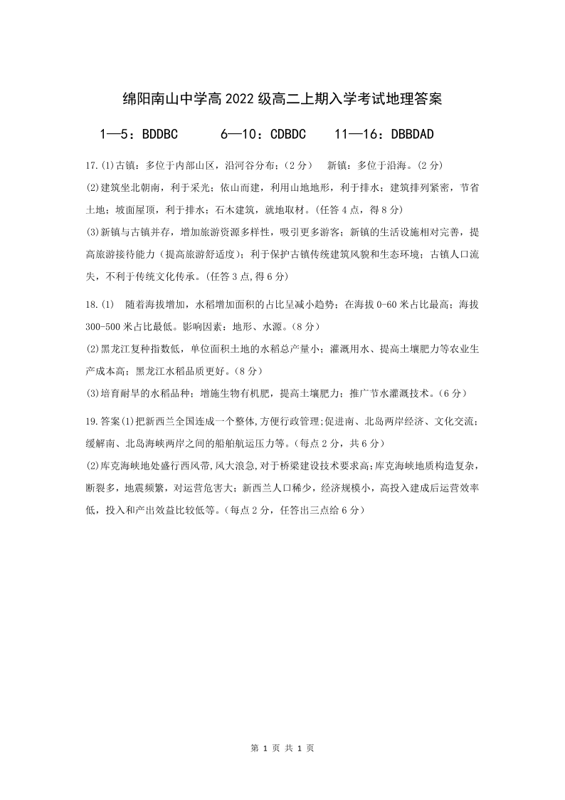 四川省绵阳南山中学2023-2024学年高二上学期入学考试地理答案