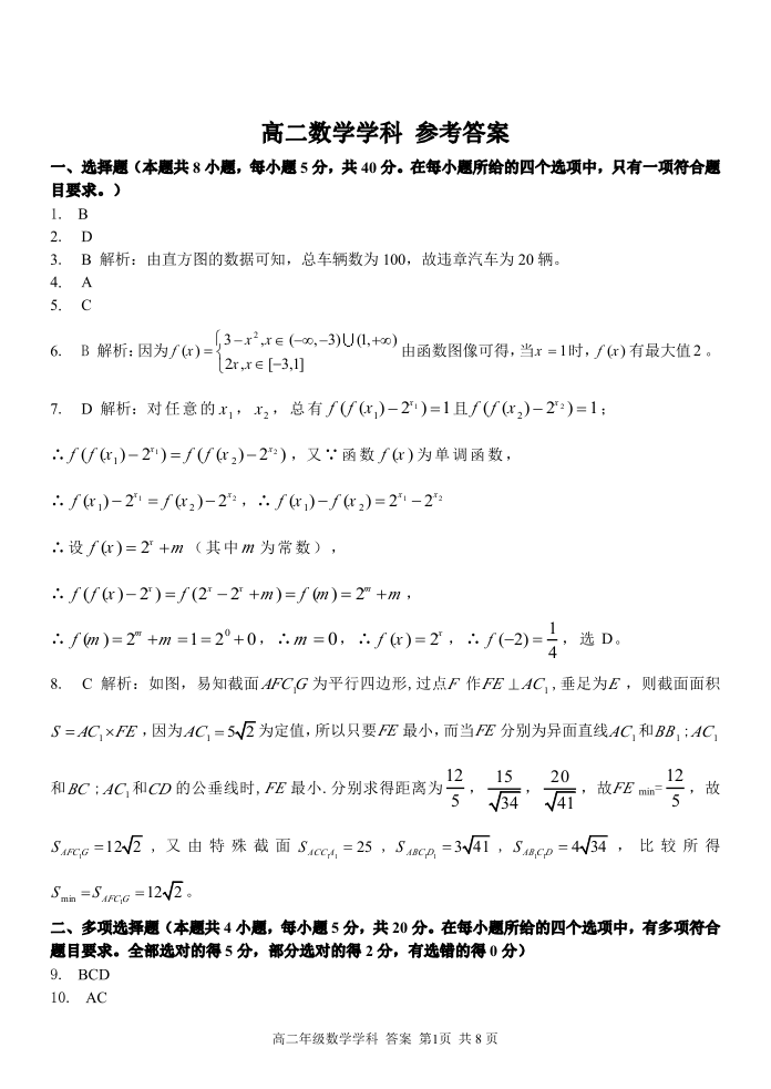 浙江省七彩阳光高考联盟高二上学期返校联考数学答案