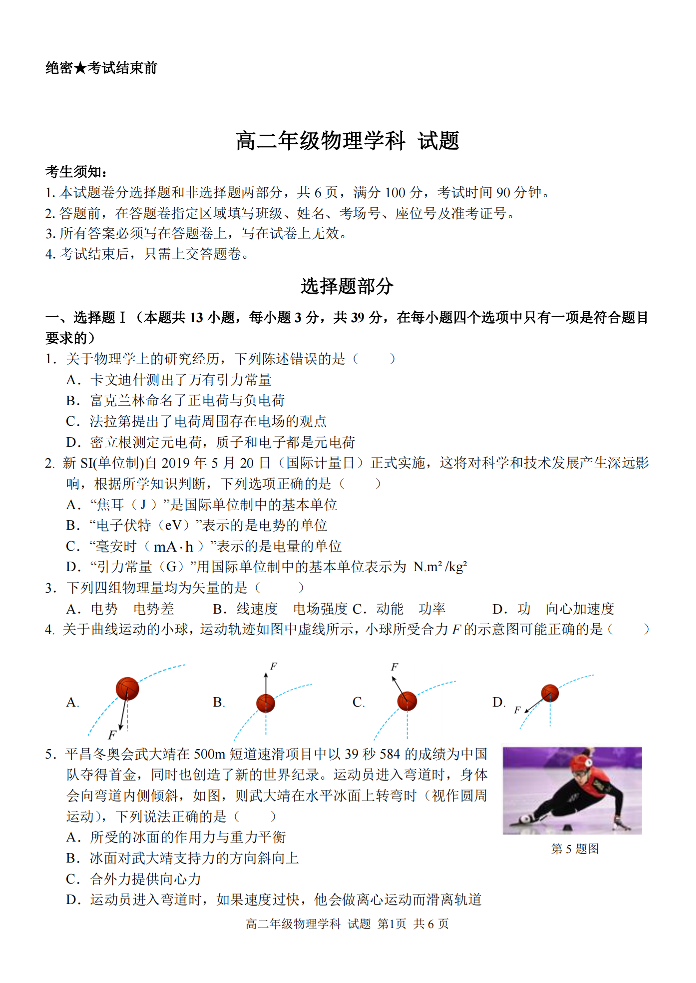 浙江省七彩阳光高考联盟高二上学期返校联考物理