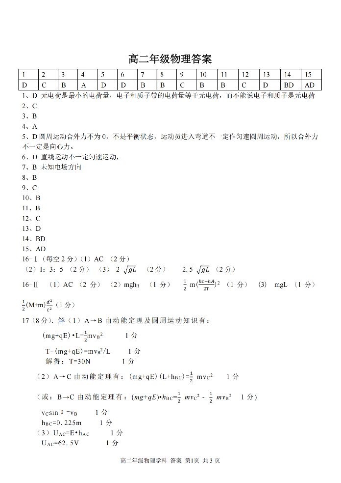 浙江省七彩阳光高考联盟高二上学期返校联考物理答案