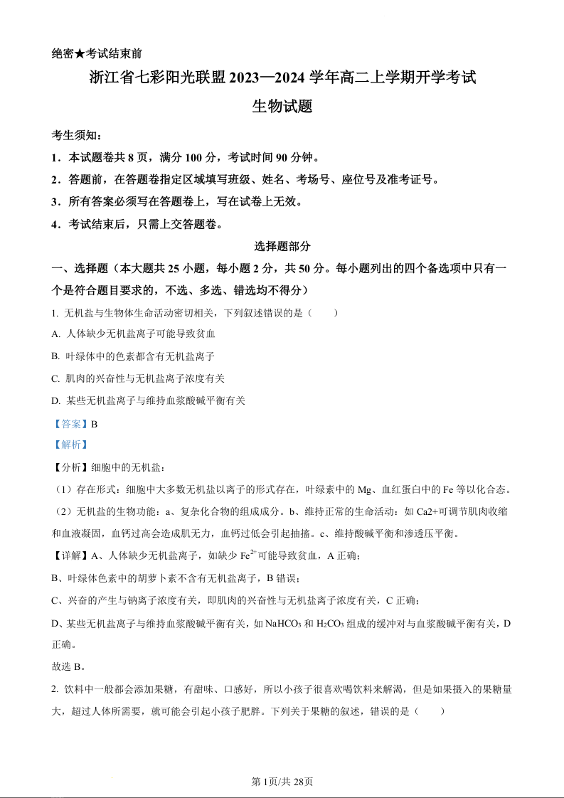 浙江省七彩阳光高考联盟高二上学期返校联考生物(精品解析版)