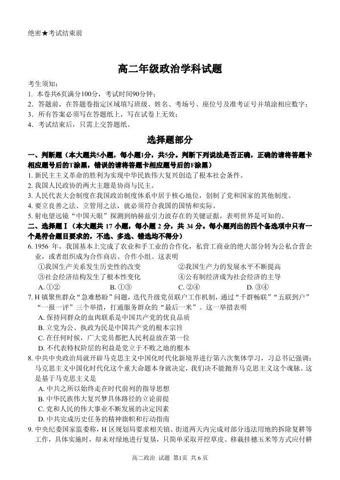 浙江省七彩阳光高考联盟高二上学期返校联考政治