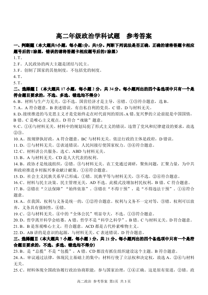 浙江省七彩阳光高考联盟高二上学期返校联考政治答案
