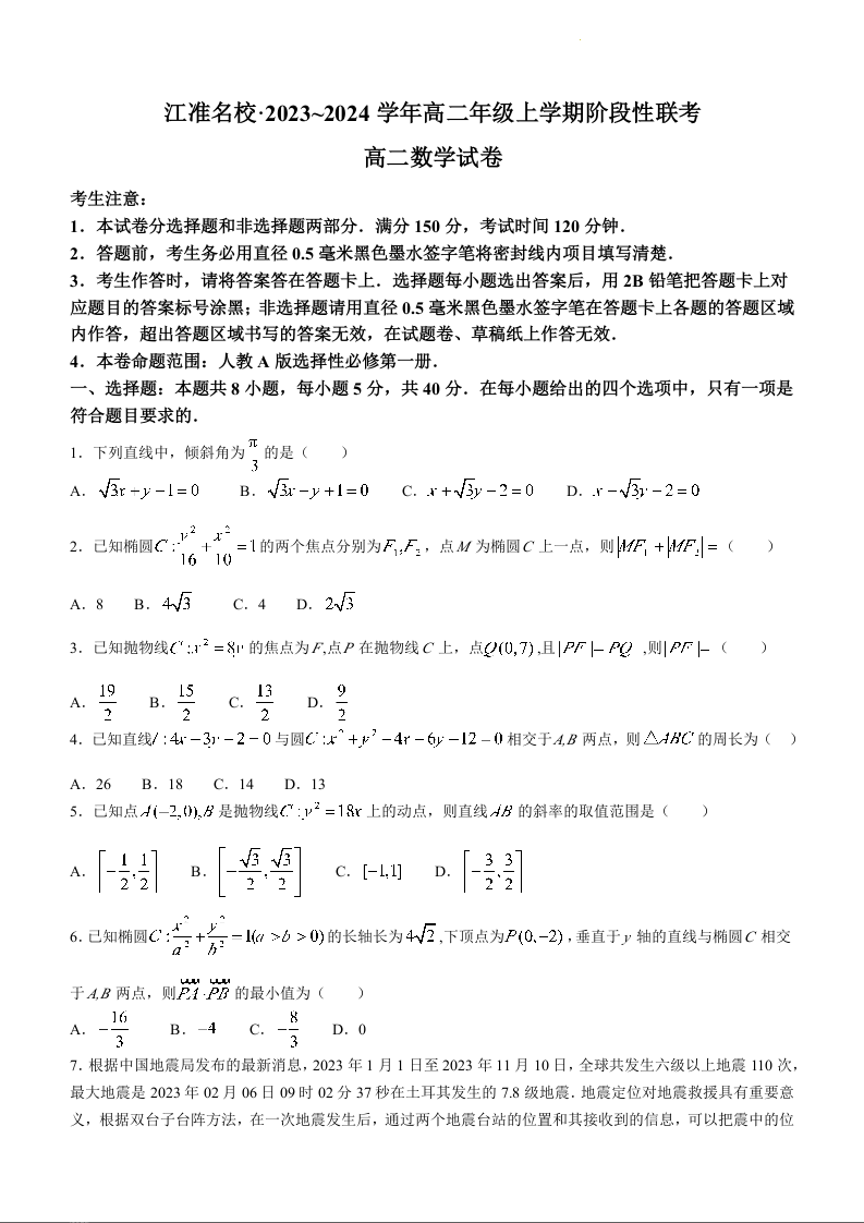 安徽省江淮名校2023-2024学年高二上学期12月阶段性联考数学+答案