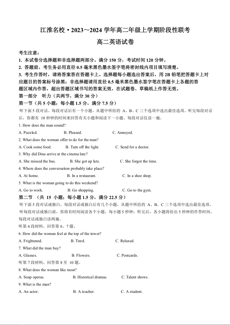 安徽省江淮名校2023-2024学年高二上学期12月阶段性联考英语+答案