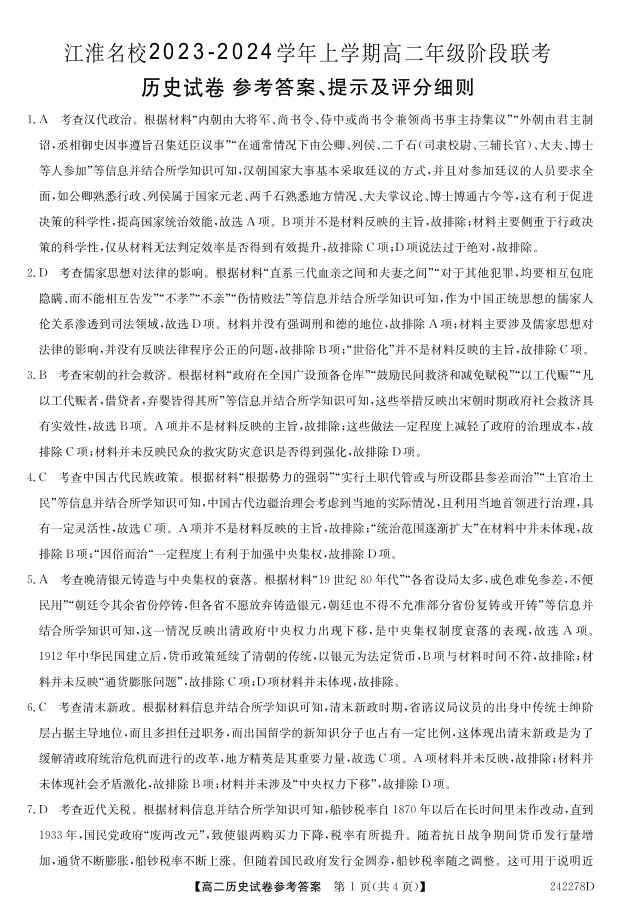 安徽省江淮名校2023-2024学年高二上学期12月阶段性联考历史答案