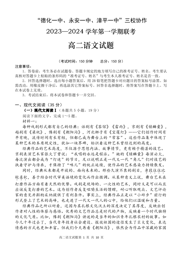 福建省德化一中、永安一中、漳平一中三校联考2023-2024学年高二上学期12月月考语文