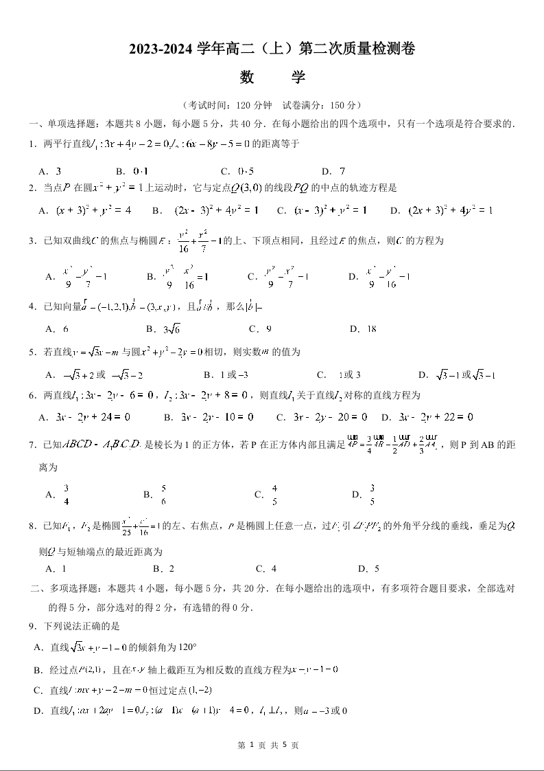 福建省德化一中、永安一中、漳平一中三校联考2023-2024学年高二上学期12月月考数学