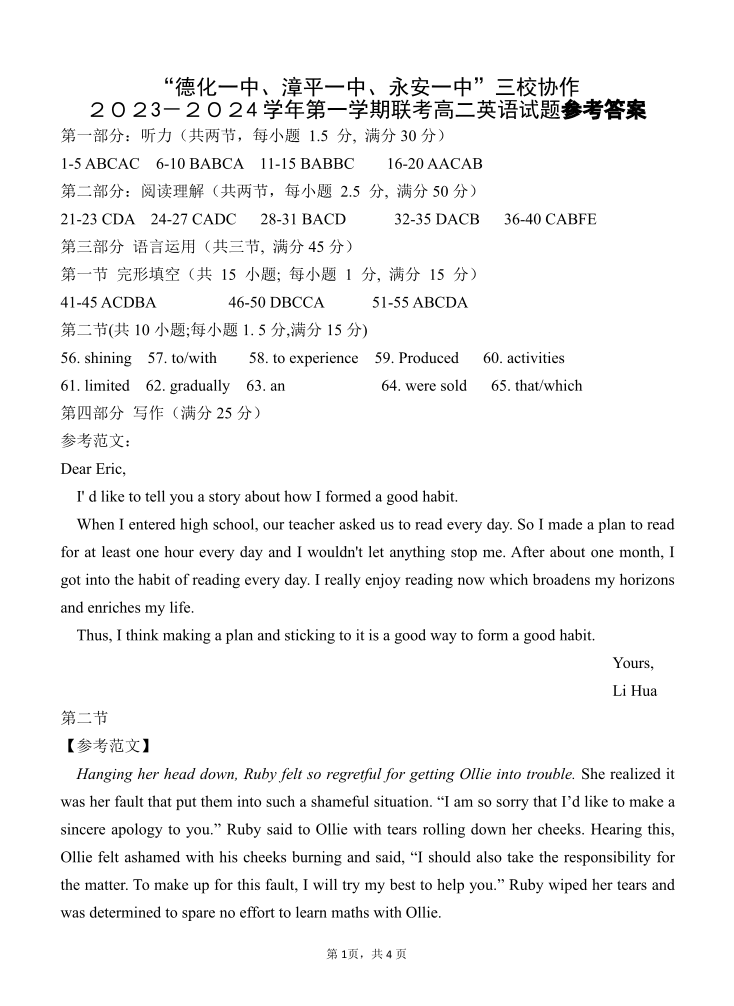福建省德化一中、永安一中、漳平一中三校联考2023-2024学年高二上学期12月月考英语答案