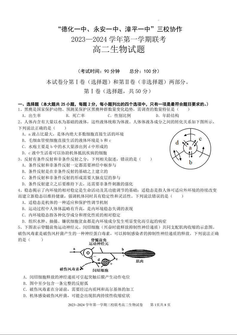 福建省德化一中、永安一中、漳平一中三校联考2023-2024学年高二上学期12月月考生物