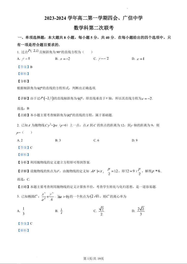 广东省四会中学、广信中学2023-2024学年高二上学期第二次月考数学(精品解析版)
