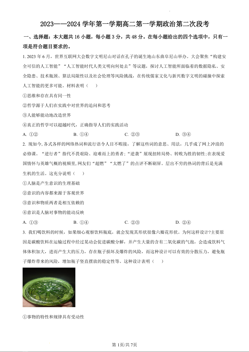 广东省四会中学、广信中学2023-2024学年高二上学期第二次月考政治(原卷版)