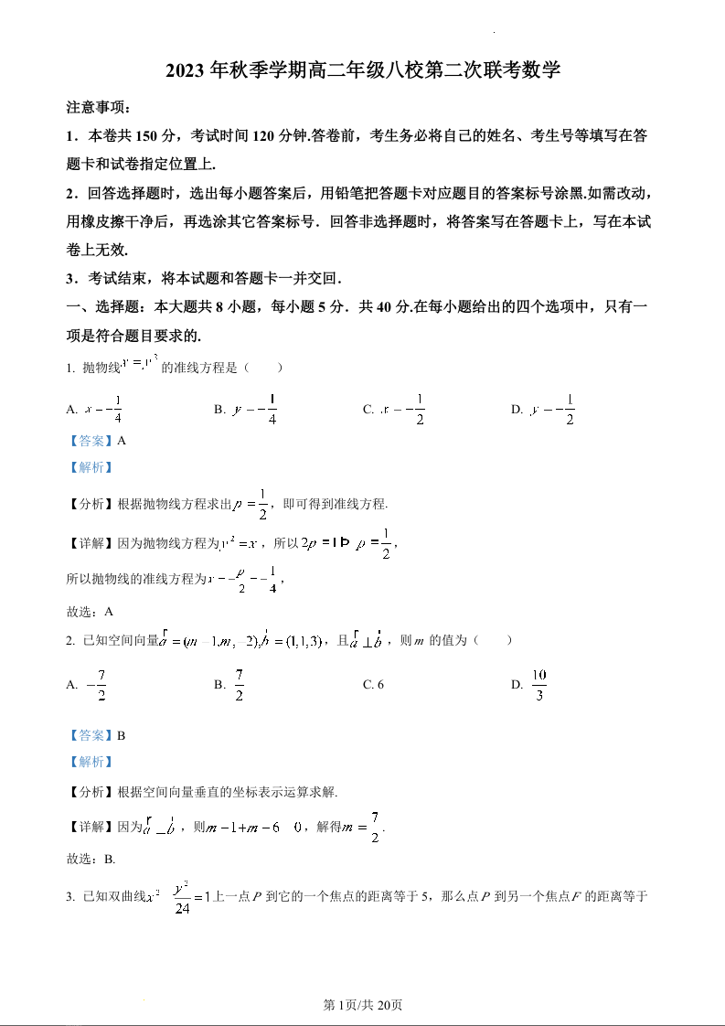广西河池市八校2023-2024学年高二上学期第二次联考(12月)数学(精品解析版)
